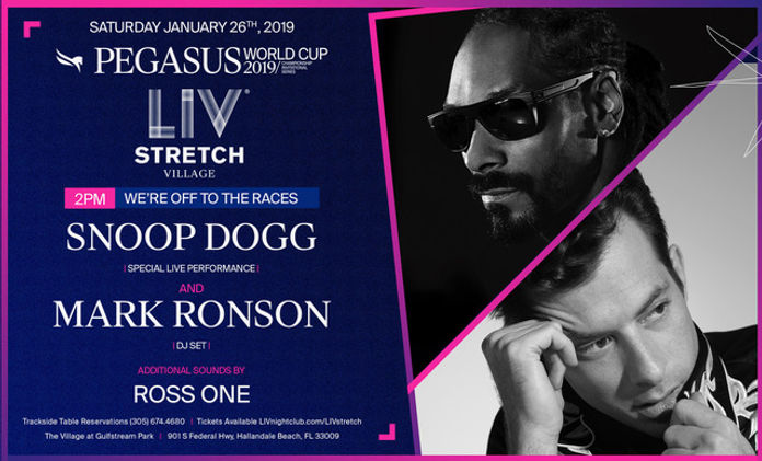 The Stronach Group will team up with Groot Hospitality’s LIV for the second year, to offer an entertainment experience unlike any other. The highly anticipated return of the trackside club known as the Pegasus LIV Stretch Village (formerly the Pegasus LIV Boardwalk) will feature race day entertainment, celebrities, VIP hospitality, eclectic programming and post-race A-list performances by award-winning rapper Snoop Dogg and Mark Ronson, the award-winning DJ & Producer who just won a Golden Globe for Best Original Song on January 6, 2019. The Pegasus LIV Stretch Village will showcase a restaurant row offering bites by Komodo, Swan, Bar Bevy and other local eateries. Tickets to Pegasus LIV Stretch Village are priced at $75 and can be purchased here: https://bit.ly/2zR8JgM/.